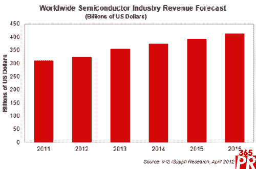 預(yù)計(jì)2012年半導(dǎo)體營(yíng)業(yè)收入將達(dá)到3246億美元,比去年的3114億美元增長(zhǎng)4%。與去年1%的增長(zhǎng)率相比,今年增長(zhǎng)情況有所改善,而且所有信號(hào)都顯示,隨著全球經(jīng)濟(jì)趨于穩(wěn)定,半導(dǎo)體產(chǎn)業(yè)將重新站穩(wěn)腳跟。除非全球市場(chǎng)出現(xiàn)意外的經(jīng)濟(jì)下滑或者半導(dǎo)體產(chǎn)業(yè)出現(xiàn)重大失策,否則營(yíng)業(yè)收入未來(lái)幾年將繼續(xù)上升,到2016年將達(dá)到4128億美元左右。