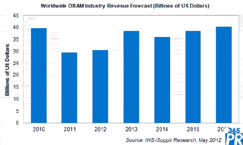 【產(chǎn)通社,5月10日訊】據(jù)IHS iSuppli公司的DRAM市場(chǎng)追蹤報(bào)告,一家大型DRAM廠商的退出導(dǎo)致供需趨于平衡,預(yù)計(jì)今年DRAM市場(chǎng)將部分扭轉(zhuǎn)2011年大幅虧損的局面,并實(shí)現(xiàn)營業(yè)收入增長。預(yù)計(jì)今年DRAM產(chǎn)業(yè)營業(yè)收入將達(dá)到306億美元,比2011年的296億美元增長3.3%。盡管看起來增幅很小,但考慮到去年銳減25%,2012年?duì)I業(yè)收入增長是一個(gè)可喜的進(jìn)展。未來幾年整體形勢(shì)將繼續(xù)改善,未來五年每年DRAM營業(yè)收入都將超過300億美元,這是該市場(chǎng)前所未有的情況。
