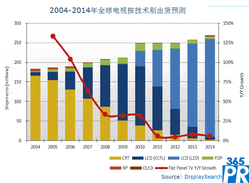 盡管全球電視總出貨量連續(xù)兩年無(wú)增長(zhǎng),但由于液晶電視不斷蠶食CRT和等離子電視市場(chǎng),預(yù)計(jì)液晶電視將持續(xù)獲得更大的市場(chǎng)份額。2012年液晶電視預(yù)計(jì)將占全球電視總出貨量的88%以上,高于2011年的82%,并將于2013年超過(guò)90%;相反地,等離子電視在2010年達(dá)到最高市占率7%后,將于2012年下降到5%。2012年液晶電視將成長(zhǎng)7%,達(dá)到2.2億臺(tái),而到2013年將達(dá)到2.41億臺(tái);2012年等離子電視出貨量將下降24%,為1千310萬(wàn)臺(tái),并將于2015年下降到3百萬(wàn)臺(tái)以下。最新的電視面板技術(shù)OLED將于2012年應(yīng)用于大尺寸電視上,但出貨量較小,僅為5萬(wàn)臺(tái)或更少。