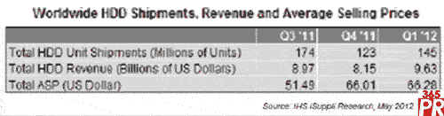 第一季度硬盤(pán)營(yíng)業(yè)收入達(dá)到96億美元,超過(guò)了2010年第一季度創(chuàng)下的高位93億美元,而且是在出貨量下降的情況下實(shí)現(xiàn)的。第一季度硬盤(pán)出貨量為1.45億個(gè),少于去年泰國(guó)發(fā)生洪災(zāi)之前的第三季度的出貨量水平1.74億個(gè)。泰國(guó)洪災(zāi)給位于泰國(guó)的硬盤(pán)工廠造成普遍破壞,預(yù)計(jì)出貨量恢復(fù)到洪災(zāi)前水平可能要等到第三季度,即這場(chǎng)災(zāi)害過(guò)去整整過(guò)去一年的時(shí)候。然而,第一季度營(yíng)業(yè)收入上升,是因?yàn)橛脖P(pán)平均銷(xiāo)售價(jià)格從去年第三季度的51.49美元上漲到了66.28美元左右。近期價(jià)格不會(huì)回到洪災(zāi)前的水平,年內(nèi)將保持在60美元以上的較高水平,從而將幫助硬盤(pán)產(chǎn)業(yè)彌補(bǔ)災(zāi)后的部分損失。