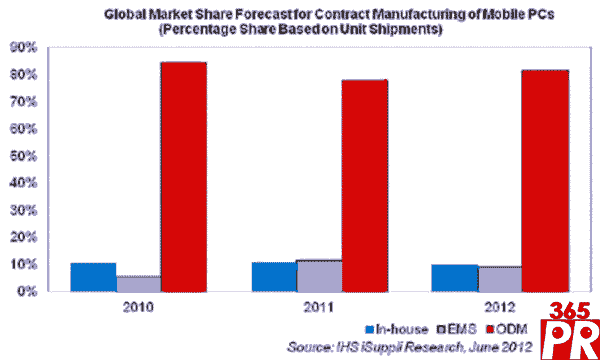 由于今年EMS廠商撤退,ODM計劃收復其在移動PC代工制造市場的失地。今年ODM的份額預計會達到81.3%,EMS占9.0%,企業(yè)內部制造占9.7%。