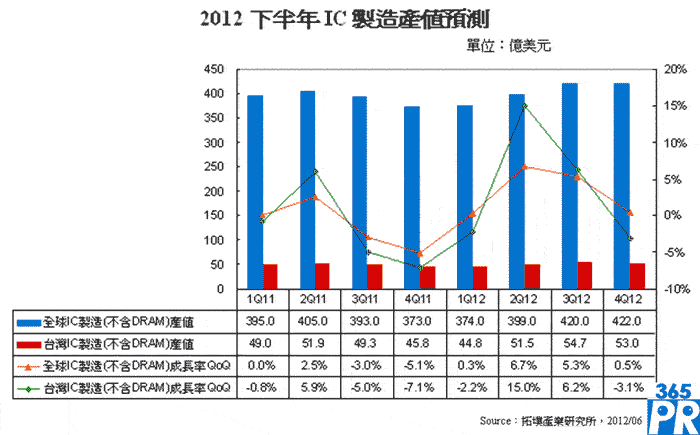 拓墣指出,在2012年首季上游芯片廠庫(kù)存去化完畢、第二季開(kāi)始回復(fù)正常季節(jié)性循環(huán)下,加上受惠于28納米產(chǎn)能不足而供不應(yīng)求現(xiàn)象,臺(tái)灣IC制造(不含DRAM)在第二季將有二位數(shù)以上成長(zhǎng),成長(zhǎng)率將遠(yuǎn)優(yōu)于全球。展望2012下半年,在終端需求緩步回溫及全球芯片廠庫(kù)存天數(shù)回升下,臺(tái)灣IC制造第三季成長(zhǎng)將放緩,但仍將成長(zhǎng)6.2%。臺(tái)灣IC封測(cè)則受惠于晶圓代工需求,下半年約成長(zhǎng)5%。