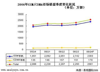 易觀國(guó)際研究表明,2006年中國(guó)手機(jī)市場(chǎng)總銷量預(yù)計(jì)達(dá)到9300萬(wàn)臺(tái),比2005年7,896萬(wàn)增加了17.8%。其中,GSM手機(jī)銷量快速增長(zhǎng),2006年銷量為8,868萬(wàn)臺(tái),比2005年7,213萬(wàn)臺(tái)上升了20.2%。各大廠商紛紛加強(qiáng)了五一、十一黃金周的產(chǎn)品營(yíng)銷,季度性變化明顯;并利用節(jié)期良好的市場(chǎng)氛圍造勢(shì),在淡季通過(guò)促銷和降價(jià)等措施加強(qiáng)手機(jī)市場(chǎng)反周期市場(chǎng)營(yíng)銷推廣,同時(shí)加大對(duì)低端市場(chǎng)的開發(fā),使得2006年銷售節(jié)節(jié)攀升。 2006年CDMA手機(jī)銷量繼續(xù)下降為632萬(wàn), 比2005年的684下降7.6%。2006年全年CDMA手機(jī)的銷量都低于整體銷量的10%。受全球CDMA市場(chǎng)萎縮的影響和聯(lián)通對(duì)手機(jī)終端補(bǔ)貼的減少,中國(guó)CDMA手機(jī)市場(chǎng)仍然萎靡。同時(shí),三星、諾基亞和LG等手機(jī)廠商的市場(chǎng)表現(xiàn)不佳也影響到了CDMA整體市場(chǎng)的銷量。 預(yù)計(jì)經(jīng)過(guò)2006年的調(diào)整期,中國(guó)CDMA終端市場(chǎng)的表現(xiàn)將得到改進(jìn)。欲了解本年度手機(jī)市場(chǎng)的更詳細(xì)資訊,請(qǐng)參閱《中國(guó)移動(dòng)終端和渠道年度綜合報(bào)告2007》或聯(lián)系易觀國(guó)際客戶服務(wù)部。電話:(86-10)6468 9258/9259/9260,傳真:(86-10)6466 7102/7103,電子郵件:cs@analysys.com.cn。