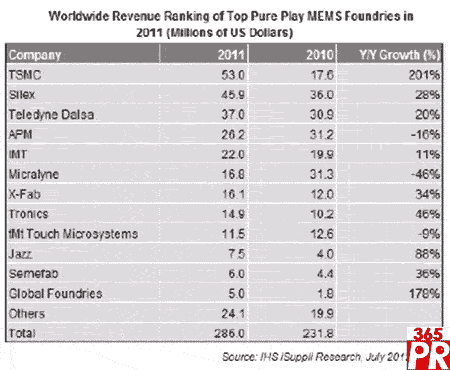 在12家提供MEMS制造業(yè)務(wù)的純代工廠商中,臺(tái)積電名列前茅。除了臺(tái)積電以外,去年MEMS營(yíng)業(yè)收入增長(zhǎng)的其它代工廠商包括Silex Microsystems、Teledyne Dalsa、Innovative Micro Technology、X-Fab, Tronics、Jazz Semiconductor、Semefab和GlobalFoundries。營(yíng)業(yè)收入下滑的廠商是Asia-Pacific Microsystems、Micralyne和tMt Touch Microsystems。