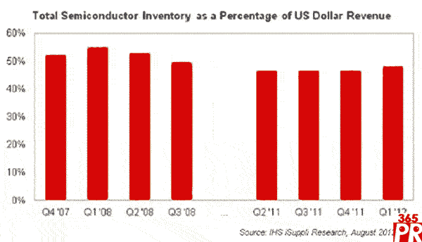 【產通社,8月8日訊】據(jù)IHS iSuppli公司的庫存簡報,廠商為即將到來的需求旺季做準備,導致半導體庫存在年初即開始上升,甚至表現(xiàn)強勁的無線半導體產業(yè)也是如此,推動庫存逼近四年前大衰退高峰時期的水平。