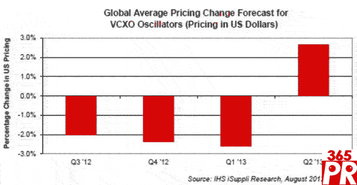 這與今年稍早的展望截然不同,當(dāng)時看來許多元件類別的價格將會上漲。這種不如人意的價格走勢在振蕩器身上得到體現(xiàn),這是一種大批量元件,廣泛用于手表、筆記本電腦、手機等電子產(chǎn)品之中。尤其是,電壓控制晶體振蕩器(VCXO)的價格第三季度預(yù)計下降2.0%,第四季度下跌2.4%,2013年第一季度下跌2.6%。而在通常情況下,其每季度價格跌幅是1.0-2.0%。