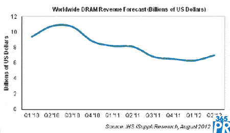 【產通社,8月27日訊】據(jù)IHS iSuppli公司的DRAM市場動態(tài)簡報,因平均銷售價格上升,DRAM市場結束連續(xù)七個季度下滑的態(tài)勢,在第二季度恢復增長。2012年第二季度DRAM營業(yè)收入為70億美元,比第一季度的63億美元勁增11%。這是DRAM產業(yè)自2010年第二季度以來首次增長,上個季度的營業(yè)收入是四年來的第三低水平。廠商對下滑局面得到扭轉感到高興,盡管第二季度營業(yè)收入遠低于2010年同期的90億-100億美元。