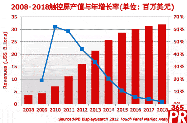 【產(chǎn)通社,9月3日訊】DisplaySearch發(fā)布2012觸控市場報告指出,2012年全球觸控屏產(chǎn)值將達到近160億美元,筆電與All-in-One一體機是主要驅(qū)動力;展望未來,2018年全球觸控屏產(chǎn)值將翻倍成長至319億美元。其中,應用于中小尺寸產(chǎn)品如智能手機與平板計算機觸控屏持續(xù)成長,2011年平板計算機用觸控屏出貨量有了3倍增長,出貨量達7960萬片,我們預估今年成長也將非常可觀,整體出貨量將超過1.3億片,2013年更將達1.9億片。從產(chǎn)值來看,平板計算機用觸控屏產(chǎn)值于2013年將超過30億美元。