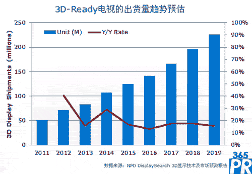 3D電視出貨量的增加,將帶動(dòng)家庭設(shè)備普及率。目前全球3D-Ready電視普及率為10%,NPD DisplaySearch預(yù)測(cè)到2019年將增長(zhǎng)至50%以上,但3D電視的實(shí)際使用可能無法快速變化。