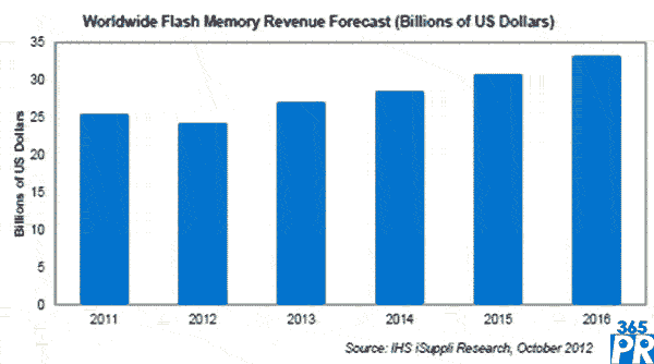 預(yù)計今年閃存市場營業(yè)收入降至243億美元,NAND占208億美元,NOR占35億美元。雖然今年營業(yè)收入因NAND價格跌幅大于預(yù)期而略低于2011年,但明年將會回升11.4%,隨后繼續(xù)穩(wěn)步增長。到2016年,總體閃存營業(yè)收入將達到333億美元,五年復(fù)合年度增長率為5.3%。