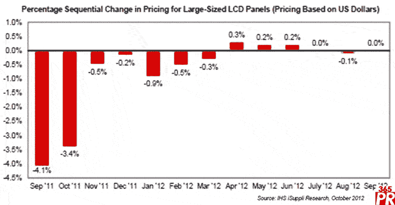 盡管8月和9月出貨量增長,但在今年剩余時間內,由于主要市場經濟形勢不佳,電視面板的前景仍然不確定。美國經濟停滯,中國經濟增長速度放緩,而歐元區(qū)國家則仍然處于債務危機之中。雖然如此,由于廠商非常小心地控制產能利用率和調整產品組合,9月面板價格保持穩(wěn)定,10月跌幅較小。