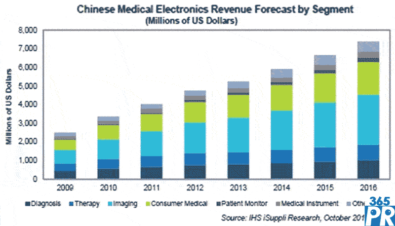 【產(chǎn)通社,10月17日訊】據(jù)IHS iSuppli公司的中國研究服務,在政府一系列政策的推動下,從2011年開始,中國醫(yī)療電子產(chǎn)業(yè)營業(yè)收入將在五年內(nèi)增長近一倍。