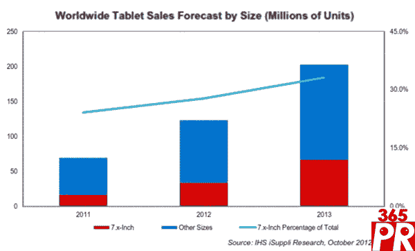 7英寸范圍,亦即7.x英寸,2012年將占總體平板電腦市場(chǎng)的28%,高于2011年的24%。2013年7.x英寸的份額將上升到33%,IHS iSuppli公司認(rèn)為這樣的預(yù)測(cè)偏于保守,有些因素今年可能推動(dòng)該市場(chǎng)達(dá)到更高的水平。
