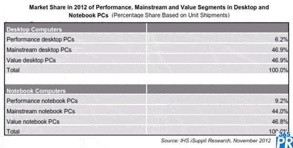 關(guān)于全球臺(tái)式電腦與筆記本占有率的最新分析顯示,從出貨量和總體市場占有率來看,被劃為“主流”或“價(jià)值”類的低端電腦,勝過屬于“高性能”類的高端PC。例如,今年主流臺(tái)式PC與價(jià)值PC占全球臺(tái)式PC市場的份額不相上下,預(yù)計(jì)均為46.9%。相比之下,高性能PC將遠(yuǎn)遠(yuǎn)排在第三位,市場份額只有6.2%。在筆記本領(lǐng)域,價(jià)值型筆記本將占46.8%,主流本占44.0%,高性能本只占9.2%。