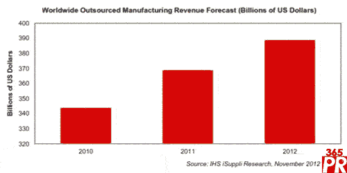 IHS公司目前預(yù)計,2012年全球外包制造業(yè)營業(yè)收入增長5%,從2011年的3690億美元上升到3890億美元。而我們在2012年6月的預(yù)測是2012年增長將近10%。今年增幅將低于2011年的7%,也明顯低于衰退之后2010年外包市場實現(xiàn)的32%增長率。