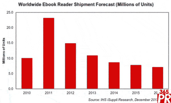 【產(chǎn)通社,12月13日訊】據(jù)IHS iSuppli公司的消費電子專題報告,繼最近幾年快速增長之后,電子書閱讀器市場急速下墜,被更加靈巧的平板設(shè)備打得潰不成軍。平板設(shè)備受到消費者的熱烈追捧。今年電子書閱讀器出貨量將降到1490萬個,比2011年的2320萬個銳減36%。目前來看,2011年似乎是電子書閱讀器市場的頂峰。明年該市場預計下滑27%,出貨量將降到1090萬個。到2016年,電子書閱讀器出貨量將萎縮到只有710萬個,比2011年的巔峰水平減少三分之二以上。