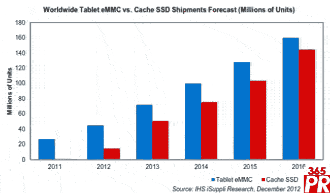 2016年,用于平板電腦的低功率型eMMC出貨量預(yù)計(jì)從今年的4500萬(wàn)個(gè)增長(zhǎng)到1.6億個(gè)。相比之下,根據(jù)目前的超級(jí)本預(yù)測(cè),超級(jí)本中使用的緩存SSD出貨量預(yù)計(jì)同期從1500萬(wàn)個(gè)上升到1.45億個(gè)。在這個(gè)預(yù)測(cè)期內(nèi),每年平板電腦eMMC出貨量均將超過(guò)緩存SSD。緩存SSD與物理硬盤(pán)配合使用,可以幫助提高超級(jí)本以及其它類(lèi)型PC的啟動(dòng)速度和性能。之所以被稱(chēng)為緩存SSD,是因?yàn)檫@種閃存被用作緩存。