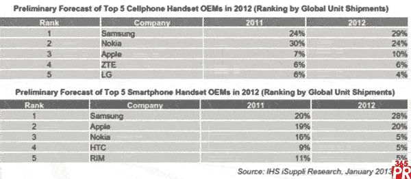 三星2012年在手機與智能手機市場均排名第一_IHS iSuppli