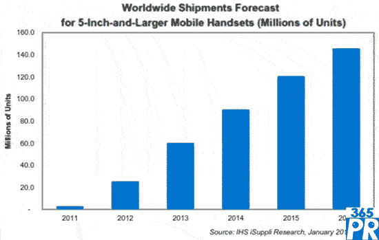 在本次展會上,采用較大面板的產(chǎn)品包括所謂的平板手機,即屏幕為英寸或者更大的智能手機。2013年,5英寸或更大屏幕手機的出貨量預(yù)計達(dá)到6040萬部,比去年大增136%。與LTPS LCD面板相關(guān)的產(chǎn)能擴(kuò)張,以及由此導(dǎo)致的大尺寸高清智能手機面板價格下降,將刺激未來幾年5英寸以及更大屏幕智能手機的出貨量以兩位數(shù)速度強勁增長。