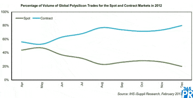 據(jù)IHS太陽能多晶硅價格指數(shù),2012年12月現(xiàn)貨市場僅占總體多晶硅銷售的20%,比5月時達到的高峰水平47%急劇下降。