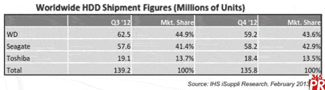 第四季度HDD市場環(huán)比下滑,是因為PC市場需求乏力,第三季度留下的過多庫存也是不利因素?傮w來看,PC市場受到較小和更加靈活的產(chǎn)品的侵蝕。消費者冷落臺式機與筆記本,偏愛智能手機與平板電腦等更加時髦的電子產(chǎn)品,而企業(yè)則繼續(xù)保持謹慎,延長了PC更換周期。同時,超級本和其它超薄電腦沒有像預期那樣火起來,讓硬盤市場受到進一步打擊。同時,媒體平板與PC平板使用閃存或固態(tài)硬盤等其它存儲形式,從HDD市場搶走更多機會。