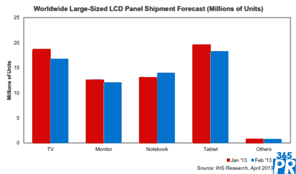 筆記本面板是出貨量增長的唯一大尺寸液晶面板領域,出貨增長7%,從1310萬個上升到1400萬個。其增長源于LG Display的特殊短期商業(yè)訂單。LG Display的2月筆記本面板出貨量增幅最大,達到27%。臺灣友達與大陸京東方的2月筆記本面板出貨量也呈現增長。據臺灣瀚宇彩晶,該公司不再專注于筆記本面板,只在有客戶需求時才生產這類面板。由于消費者興趣轉向平板電腦和智能手機,筆記本電腦銷量全面下降,筆記本面板也成為這種變化的犧牲品。