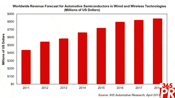 【產(chǎn)通社,4月4日訊】據(jù)IHS公司的汽車信息娛樂市場(chǎng)追蹤報(bào)告,由于消費(fèi)者要求把移動(dòng)設(shè)備中的高清視頻發(fā)送到車內(nèi)顯示器上顯示,汽車有線及無線網(wǎng)絡(luò)應(yīng)用中使用的半導(dǎo)體市場(chǎng)預(yù)計(jì)在2011-2018年增長(zhǎng)近一倍。2018年車內(nèi)連接與網(wǎng)絡(luò)使用的半導(dǎo)體營(yíng)業(yè)收入預(yù)計(jì)達(dá)到8.418億美元,而2011年是4.388億美元。今年該市場(chǎng)預(yù)計(jì)從去年的5.451億美元增長(zhǎng)到5.854億美元。明年將大增到6.634億美元,隨后兩年增長(zhǎng)到7億美元以上,2017年將突破8億美元大關(guān)。