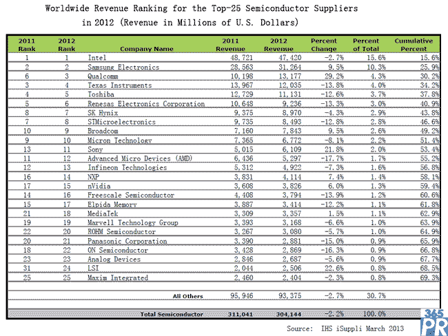 在前25家供應(yīng)商中,2012年實(shí)現(xiàn)收入增長的公司包括第2名三星、第3名高通、第9名博通、第11名索尼、第14名恩智浦、第15名英偉達(dá)、第18名聯(lián)發(fā)科和第24名美商巨積。其余17家供應(yīng)商都遭受了收入下滑。收入遭受兩位數(shù)下滑的公司包括第4名德州儀器、第5名東芝、第6名瑞薩、第8名意法半導(dǎo)體、第12名超微半導(dǎo)體、第16名飛思卡爾、第17名爾必達(dá)、第21名松下和第22名安森美半導(dǎo)體。