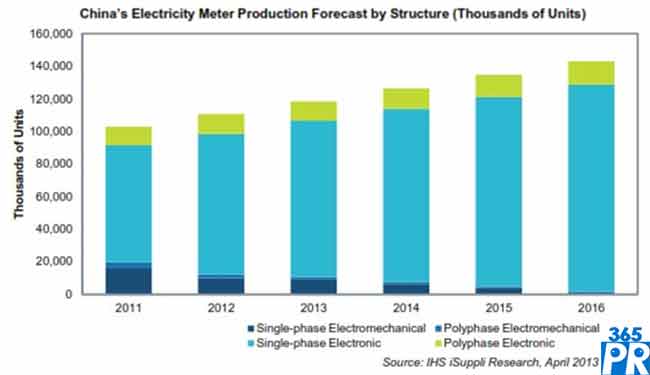 2012年中國電表總出貨量為1.106億個,其中智能電表是9850萬個。今年中國電表產(chǎn)量預計增長到1.184億個,其中1.077億個將是智能電表。在之后的幾年內(nèi),中國智能電表市場將繼續(xù)增長,平均復合年度增長率為9.5%。自然,隨著替換速度加快,普通電表的產(chǎn)量將快速下滑,到2016年接近消亡。