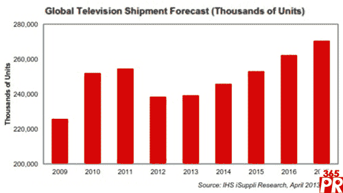 到2017年,全球電視出貨量將增長(zhǎng)到2.705億臺(tái),理由如下:中國(guó)廠商向亞太市場(chǎng)推出大量新型號(hào);日本、北美和西歐繼續(xù)復(fù)蘇,而超高清(UHD)和OLED電視價(jià)格將更容易令人接受。