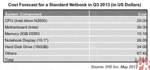 現(xiàn)在超級本和其它超薄本的價格高達1000美元或者更高。鑒于目前移動PC的價格,上述那么低的價格點似乎難以達到。但是,幾年前上網(wǎng)本高峰時期的價格曾降到200多美元,而且上網(wǎng)本的成本分析顯示,這樣低的價格水平可以用來支持基本功能型超薄PC。IHS計算平臺成本分析服務(wù)計算了2013年第三季度上網(wǎng)本主要部件的成本,結(jié)果顯示標(biāo)準(zhǔn)上網(wǎng)本的成本約為207.82美元。