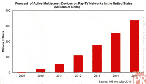 2012年美國可以訪問來自付費電視網絡的服務的多屏幕設備數量是1.12億個,預計2015年將大增到3.38億個。多屏幕是一種服務,允許用戶使用與有線或衛(wèi)星機頂盒相連的傳統(tǒng)電視模式以外的方式,在多種平臺上觀看視頻。