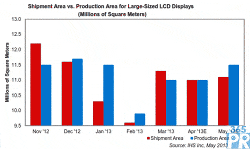 這是大尺寸液晶面板出貨面積四個月來首次超過產(chǎn)量面積。大尺寸液晶面板是指對角尺寸大于9.x英寸的面板,用于筆記本、監(jiān)視器和電視;以用于平板電腦的大于7.x英寸的面板。上次出貨量高于產(chǎn)量的情景發(fā)生在2012年11月,當(dāng)時的原因容易理解,因為廠商爭相出貨更多的面板,以滿足12月假日季節(jié)和中國春節(jié)的需求。今年3月,面板供應(yīng)商采取同樣的策略來清理庫存。從2012年12月到2013年3月,出貨量低于產(chǎn)量,導(dǎo)致庫存不斷積累。