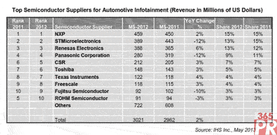 2012年,汽車銷售娛樂(lè)領(lǐng)域最大的專用標(biāo)準(zhǔn)產(chǎn)品(ASSP)半導(dǎo)體供應(yīng)商是荷蘭恩智浦半導(dǎo)體(NXP),營(yíng)業(yè)收入為4.59億美元,占有15%的市場(chǎng)份額。法國(guó)-意大利企業(yè)意法半導(dǎo)體排名第二,營(yíng)業(yè)收入為3.89億美元,市場(chǎng)份額是13%。日本瑞薩電子排名第三,營(yíng)業(yè)收入僅比意法半導(dǎo)體少100萬(wàn)美元,是3.88億美元,市場(chǎng)份額也是13%。