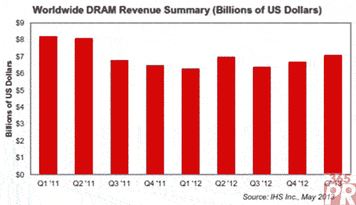 【產(chǎn)通社,5月30日訊】據(jù)IHS公司的DRAM市場(chǎng)動(dòng)態(tài)簡(jiǎn)報(bào),在平均銷售價(jià)格上升的推動(dòng)下,DRAM市場(chǎng)繼續(xù)上行,第一季度營業(yè)收入連續(xù)第二個(gè)月環(huán)比增長(zhǎng)。今年1-3月DRAM營業(yè)收入從2012年第四季度的67億美元增長(zhǎng)到71億美元,而且高于第三季度的64億美元。第一季度營業(yè)收入創(chuàng)出了將近兩年來的最高水平,僅低于2011年第二季度的81億美元。