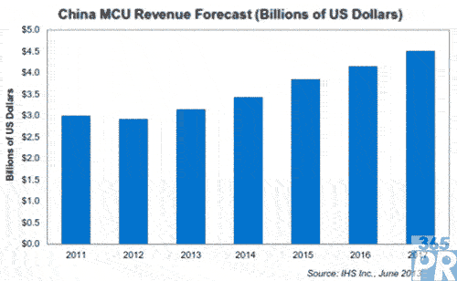 【產(chǎn)通社,6月25日訊】據(jù)IHS公司的一份中國研究專題報告,繼2012年萎縮之后,隨著能效要求與設備升級推動嵌入及自動應用對于MCU芯片的需求增長,中國微控制器(MCU)市場今年有望回升。今年中國MCU市場的營業(yè)收入預計達到31億美元,比2012年的29億美元增長7.7%。去年該市場收縮2.6%,但從2013年開始至少會連續(xù)五年保持增長,預計2017年達到45億美元。