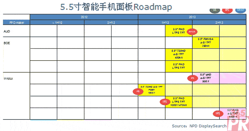 NPD DisplaySearch指出, 以5.5吋產(chǎn)品為例,三星Galaxy Note II系列采用5.5吋1280×720分辨率AMOLED面板并于消費(fèi)者市場(chǎng)獲得認(rèn)可。而LG和聯(lián)想則分別于Optimus G和K900系列采用了1920×1080 LTPS TFT顯示面板。未來(lái)5.5吋高階手機(jī)產(chǎn)品將繼續(xù)保持720HD及FHD的產(chǎn)品規(guī)格,而主流面板廠商下半年亦多有產(chǎn)品布局,其中AUO(友達(dá))、BOE(京東方)、Innolux(群創(chuàng))、LG Display、Sharp和JDI皆有FHD LTPS產(chǎn)品開(kāi)出,而除三星繼續(xù)生產(chǎn)720HD AMOLED產(chǎn)品外,BOE(京東方)和Innolux(群創(chuàng))將會(huì)開(kāi)出720HD a-Si(非晶硅)TFT產(chǎn)品,而JDI亦有基于LTPS(低溫多晶硅)的720HD產(chǎn)品規(guī)劃。