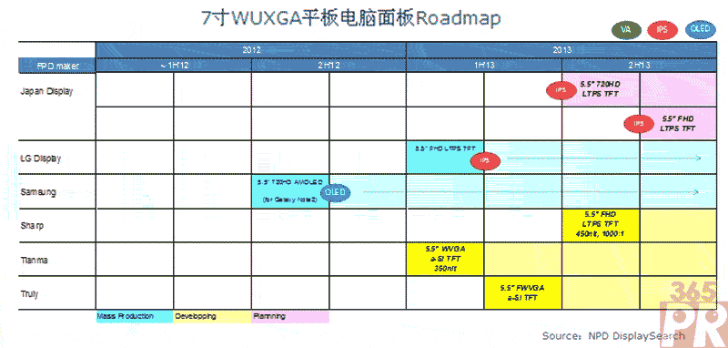 NPD DisplaySearch 指出, 以7吋產(chǎn)品為例,主流面板供貨商多有WUXGA規(guī)格在計(jì)劃在下半年開(kāi)出。其中BOE(京東方)、CPT(華映)、IVO(龍騰)、LG Display、Panasonic基于原有a-Si(非晶硅)TFT產(chǎn)品進(jìn)行升級(jí),JDI、Tianma(天馬)則計(jì)劃采用LTPS(低溫多晶硅)技術(shù),而Hannstar經(jīng)過(guò)評(píng)估后則采取了Oxide(金屬氧化物)技術(shù)路線。此外,Sharp將會(huì)推出基于LTPS或Oxide的WUXGA產(chǎn)品。由于產(chǎn)品參數(shù)已達(dá)325ppi,技術(shù)難度較高,將會(huì)考驗(yàn)各面板廠商的技術(shù)能力及穩(wěn)定量產(chǎn)能力。