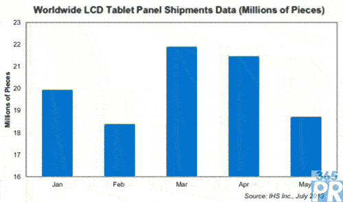 【產(chǎn)通社,7月31日訊】據(jù)IHS公司的液晶產(chǎn)業(yè)追蹤報告,5月份平板電腦面板出貨量下降,因平板電腦品牌廠商消化現(xiàn)有庫存,并在一年中銷售最旺的季節(jié)到來前評估形勢。