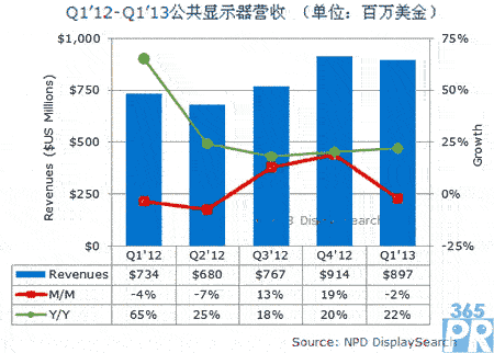 【產(chǎn)通社,9月14日訊】根據(jù)NPD DisplaySearch最新報(bào)告指出,全球公共顯示器Q1'12至Q1'13出貨量成長(zhǎng)22%,銷售額從7.336億美元成長(zhǎng)至8.969億美元。主要銷售額增加的原因是更大尺寸出貨量增加,及更高單價(jià)的顯示器和超窄邊框顯示器出貨量的增加,這些顯示器主要是被用于戶外的電視墻和數(shù)字廣告牌應(yīng)用上。