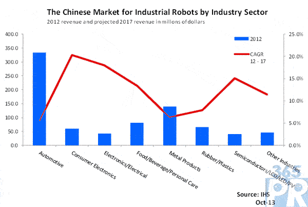 2012年汽車行業(yè)還是中國工業(yè)機(jī)器人的主要市場,占到這個(gè)市場大小的40%左右。隨著汽車行業(yè)的投資增長速度放緩,汽車市場體量變大及成熟,工業(yè)機(jī)器人在汽車行業(yè)的增長率預(yù)計(jì)將會(huì)增長最慢(從2012年至2017年的年均復(fù)合增長率為5.6%),而且增速將逐漸下滑。為了補(bǔ)償汽車市場的放緩,工業(yè)機(jī)器人廠商都在嘗試開拓一般工業(yè)市場。