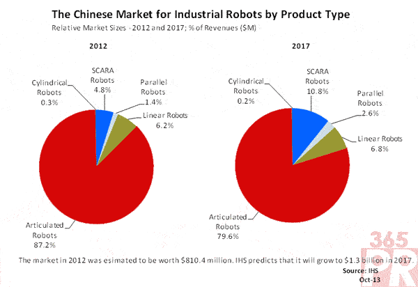 IHS公司分析師湯潔認(rèn)為,“目前中國工業(yè)機(jī)器人市場主要以關(guān)節(jié)坐標(biāo)式機(jī)器人為主。這主要是因?yàn)楣I(yè)機(jī)器人的大客戶還都是來自于汽車行業(yè),并且主要用于焊接領(lǐng)域。隨著汽車行業(yè)市場的成熟,未來汽車行業(yè)市場增速將逐步減緩,一般工業(yè)逐漸成為了各大工業(yè)機(jī)器人廠家競相角逐的新市場!