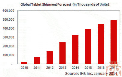 平板電腦(包括媒體平板和PC平板)發(fā)貨量將在2017年達到4.88億臺,預(yù)計2014年全球平板出貨量將劇增72%,達到2.43億臺,而2012年僅僅1.41億臺,增長動力來自亞洲的低價設(shè)備,另外還有PC型平板產(chǎn)品出貨量的增加,這類產(chǎn)品將在CES 2014上得到充分展示。