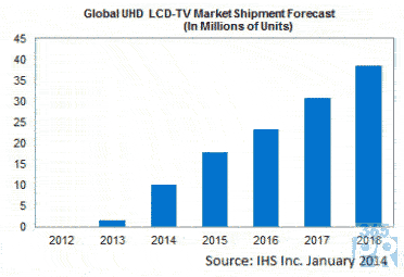 超高清電視(UHD LCD TV)由于價格銳降,出貨量將從2013年的150萬臺,增加到2018年的3850萬臺,但在所有LCD電視機出貨中的占比僅僅16%,而2014年的出貨量將增加為1000萬臺。