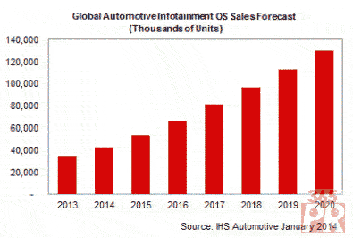 IHS認(rèn)為,汽車信息操作系統(tǒng)市場即將進入快車道,將為軟件業(yè)者提供重大機會,該操作系統(tǒng)平臺的銷售額將在2020年攀升至1.3億套,相當(dāng)于1999年全球PC市場的規(guī)模。