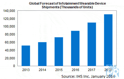 穿戴式信息設(shè)備市場2013-2018年增幅將高達155%,出貨量將從2013年的5120萬套增加到1.307億套,代表產(chǎn)品包括藍(lán)牙耳機、頭戴式顯示器、成像產(chǎn)品、智能眼鏡和智能手表等。