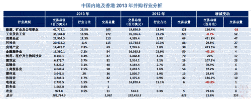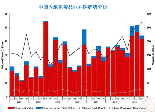 2013年中國(guó)內(nèi)地消費(fèi)品業(yè)并購(gòu)交易總值達(dá)176億美元,較去年同期39億美元的總值高出近3.5倍,創(chuàng)出并購(gòu)市場(chǎng)資訊數(shù)據(jù)庫(kù)的歷史新高。