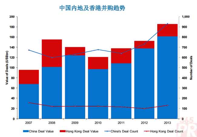 【產(chǎn)通社,1月15日訊】2013年中國(guó)內(nèi)地及香港并購(gòu)市場(chǎng)成交活躍,全年共達(dá)成1,062單交易,交易總值達(dá)1,857億美元,較2012年1,524億美元的(829單)總值增長(zhǎng)了21.8%。以交易總值與交易總量計(jì),均創(chuàng)下2001年以來(lái)的新高。