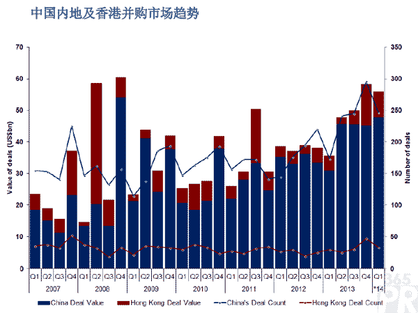 【產(chǎn)通社,4月17日訊】2014年第一季度,中國內(nèi)地及香港并購市場錄得交易總值559億美元,較2013年第一季度356億美元總值躍升了57.1%。這得益于中國內(nèi)地并購交易的增長——當(dāng)季內(nèi)地市場錄得交易總值478億美元,是2009年第一季度(213億美元)以來的單季最高值。