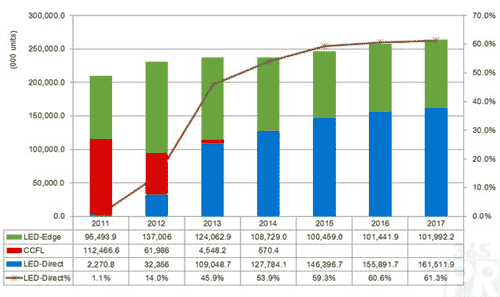 NPD DisplaySearch表示,自2011年開始的直下式背光模塊的概念是取代傳統(tǒng)的CCFl背光模塊,主要原理是犧牲掉厚度而得到較好的成本優(yōu)勢(shì)。不過隨著技術(shù)越來越進(jìn)步,當(dāng)厚度已經(jīng)只需要犧牲一些或是厚度和側(cè)入式的背光一樣薄的時(shí)候,直下式背光模塊成本上的優(yōu)勢(shì)及其他優(yōu)勢(shì),例如易于做窄邊框、適合做local dimming會(huì)逐漸被侵蝕到側(cè)入式的高階機(jī)種中。側(cè)入式高階機(jī)種的主要的概念是不需犧牲厚度又可以降低成本。2013到2014年,直下式背光滲透率無(wú)意外地大幅提高,由45.9%提升至53.9%,年度成長(zhǎng)和2013年相比約為17.1%。